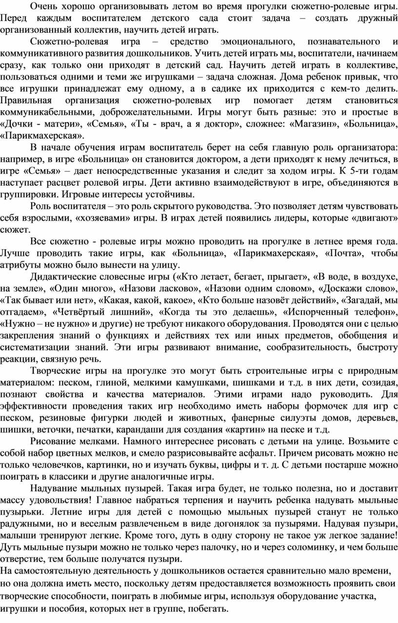 Очень хорошо организовывать летом во время прогулки сюжетно-ролевые игры. Перед каждым воспитателем детского сада стоит задача – создать дружный организованный коллектив, научить детей играть.