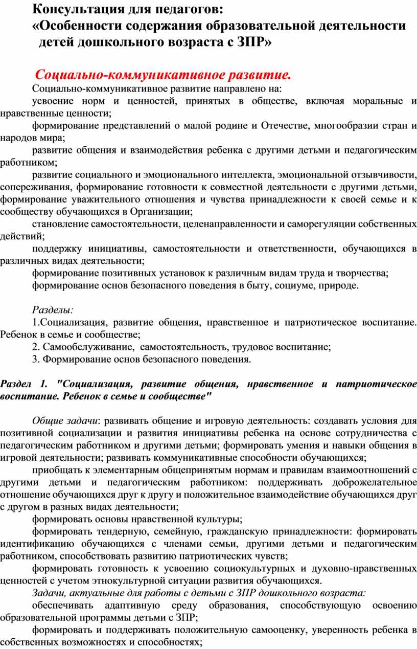 Раздел 1. "Социализация, развитие общения, нравственное и патриотическое воспитание. Ребенок в семье и сообществе"