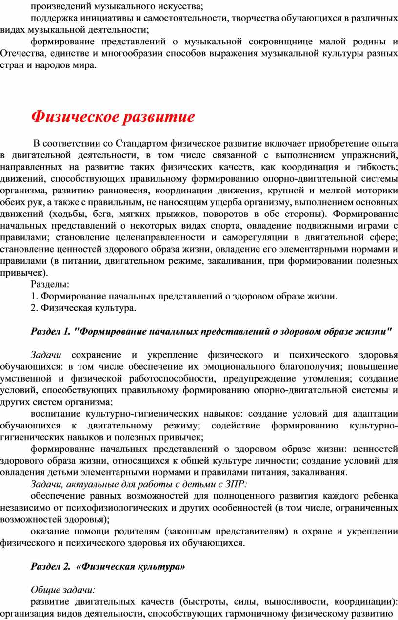 В соответствии со Стандартом физическое развитие включает приобретение опыта в двигательной деятельности, в том числе связанной с выполнением упражнений, направленных на развитие таких физических качеств, как координация и гибкость; движений, способствующих правильному формированию опорно-двигательной системы организма, развитию равновесия, координации движения, крупной и мелкой моторики обеих рук, а также с правильным, не наносящим ущерба организму, выполнением основных движений (ходьбы, бега, мягких прыжков, поворотов в обе стороны). Формирование начальных представлений о некоторых видах спорта, овладение подвижными играми с правилами; становление целенаправленности и саморегуляции в двигательной сфере; становление ценностей здорового образа жизни, овладение его элементарными нормами и правилами (в питании, двигательном режиме, закаливании, при формировании полезных привычек).