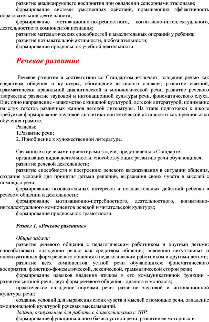 Речевое развитие в соответствии со Стандартом включает: владение речью как средством общения и культуры; обогащение активного словаря; развитие связной, грамматически правильной диалогической и монологической речи; развитие речевого творчества; развитие звуковой и интонационной культуры речи, фонематического слуха. Еще одно направление - знакомство с книжной культурой, детской литературой, понимание на слух текстов различных жанров детской литературы. На этапе подготовки к школе требуется формирование звуковой аналитико-синтетической активности как предпосылки обучения грамоте.