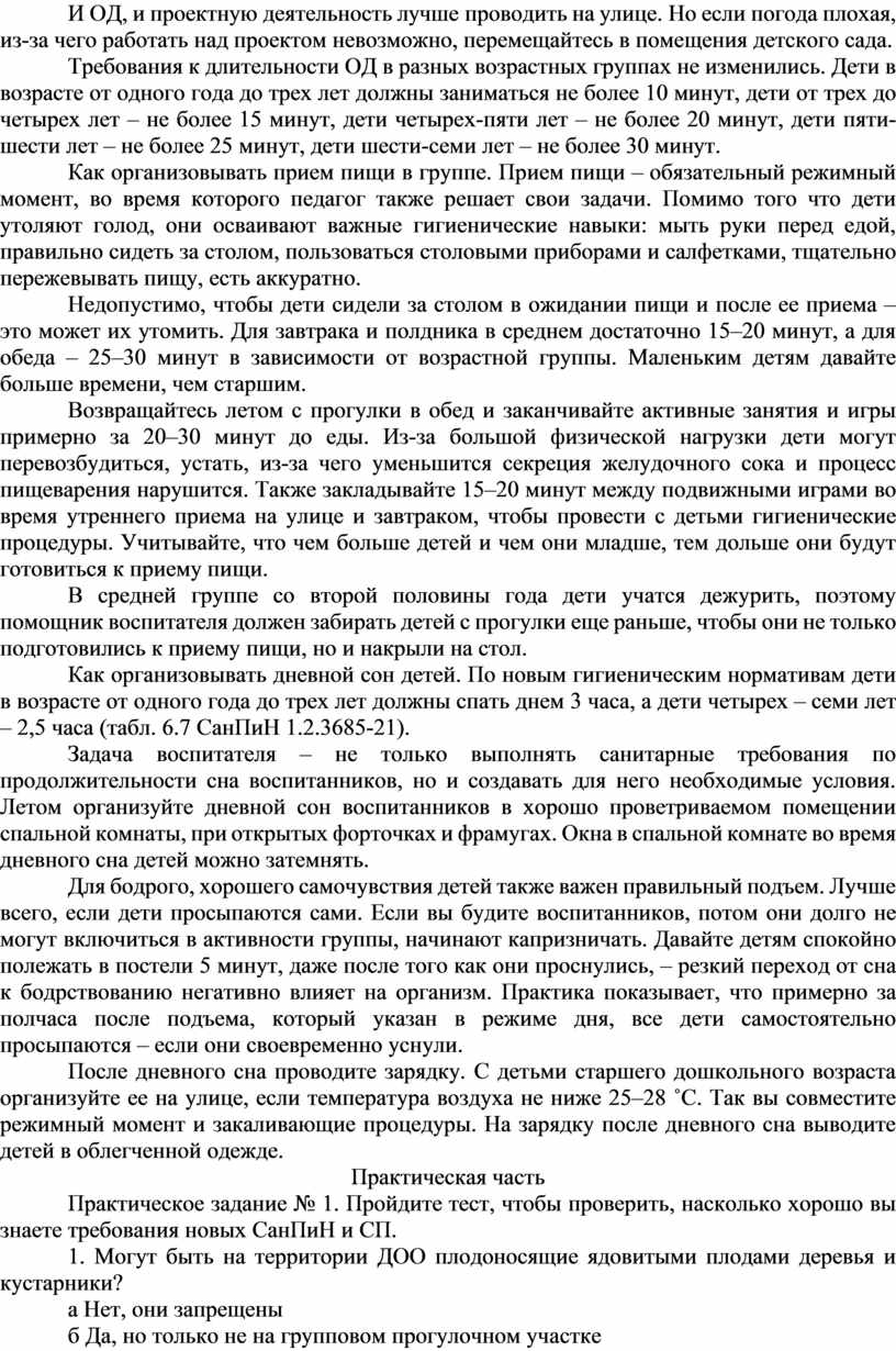 Практическое задание № 2. Проверьте ваши планы работы с детьми летом. При необходимости внесите в них изменения, чтобы не нарушать нормы новых СанПиН и СП. Готовые планы покажите в рамках индивидуальных встреч со старшим воспитателем.