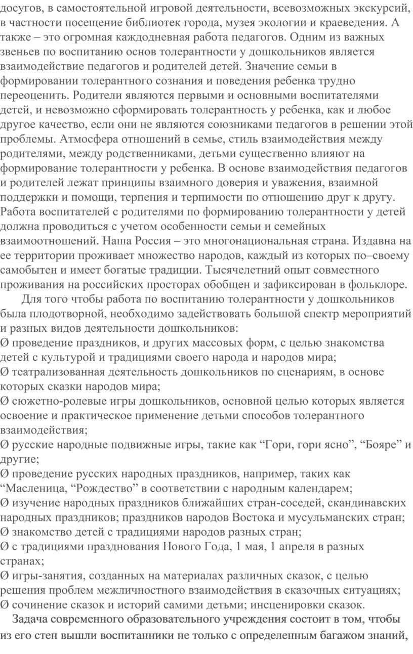 В формировании толерантности у дошкольников необходимо опираться на игровые методы воспитания, так как игра является основным видом деятельности детей дошкольного возраста. Основы толерантности закладываются у дошкольников в процессе работы на занятиях, во время досугов, в самостоятельной игровой деятельности, всевозможных экскурсий, в частности посещение библиотек города, музея экологии и краеведения. А также – это огромная каждодневная работа педагогов. Одним из важных звеньев по воспитанию основ толерантности у дошкольников является взаимодействие педагогов и родителей детей. Значение семьи в формировании толерантного сознания и поведения ребенка трудно переоценить. Родители являются первыми и основными воспитателями детей, и невозможно сформировать толерантность у ребенка, как и любое другое качество, если они не являются союзниками педагогов в решении этой проблемы. Атмосфера отношений в семье, стиль взаимодействия между родителями, между родственниками, детьми существенно влияют на формирование толерантности у ребенка. В основе взаимодействия педагогов и родителей лежат принципы взаимного доверия и уважения, взаимной поддержки и помощи, терпения и терпимости по отношению друг к другу. Работа воспитателей с родителями по формированию толерантности у детей должна проводиться с учетом особенности семьи и семейных взаимоотношений. Наша Россия – это многонациональная страна. Издавна на ее территории проживает множество народов, каждый из которых по–своему самобытен и имеет богатые традиции. Тысячелетний опыт совместного проживания на российских просторах обобщен и зафиксирован в фольклоре.