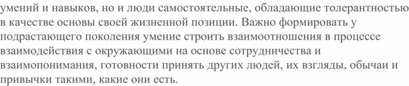 Задача современного образовательного учреждения состоит в том, чтобы из его стен вышли воспитанники не только с определенным багажом знаний, умений и навыков, но и люди самостоятельные, обладающие толерантностью в качестве основы своей жизненной позиции. Важно формировать у подрастающего поколения умение строить взаимоотношения в процессе взаимодействия с окружающими на основе сотрудничества и взаимопонимания, готовности принять других людей, их взгляды, обычаи и привычки такими, какие они есть.