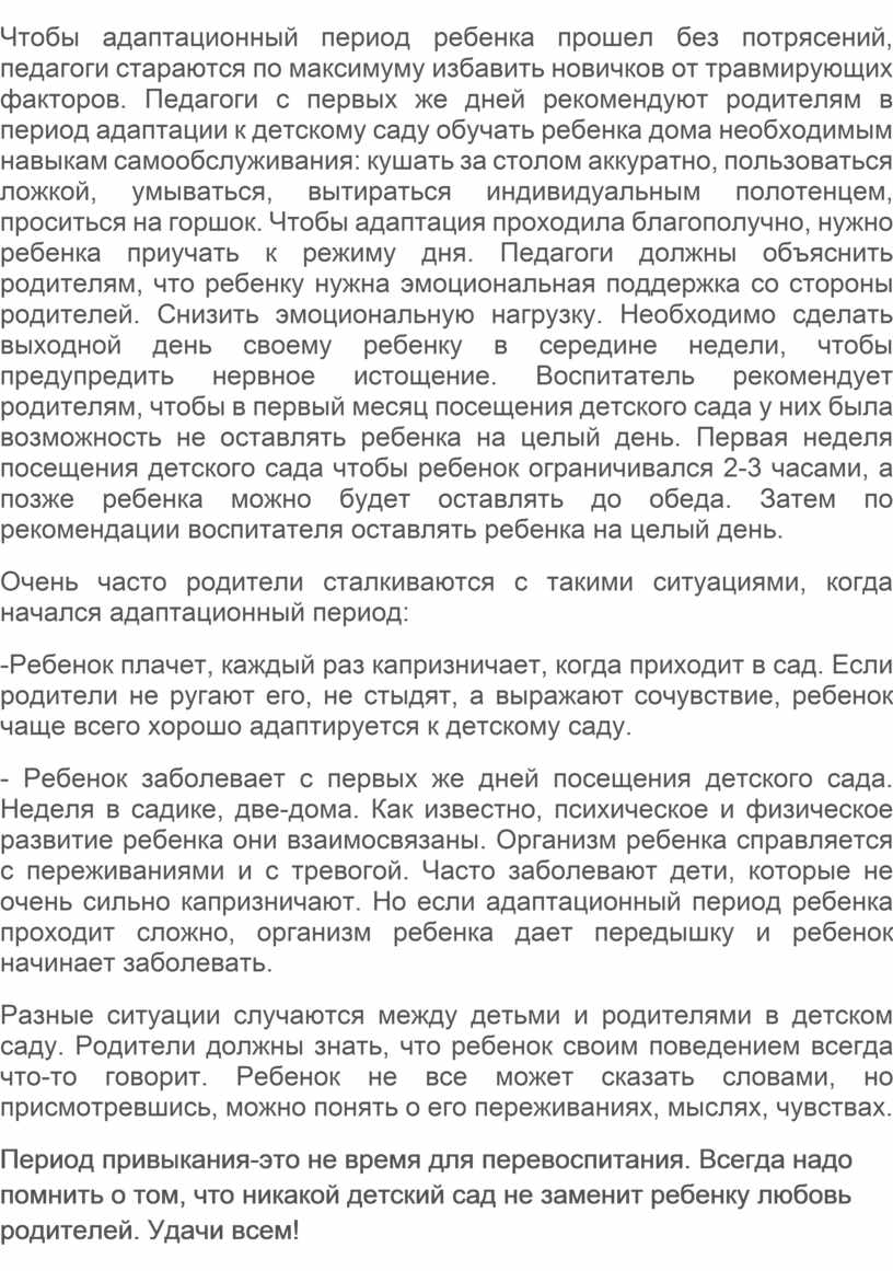 Чтобы адаптационный период ребенка прошел без потрясений, педагоги стараются по максимуму избавить новичков от травмирующих факторов. Педагоги с первых же дней рекомендуют родителям в период адаптации к детскому саду обучать ребенка дома необходимым навыкам самообслуживания: кушать за столом аккуратно, пользоваться ложкой, умываться, вытираться индивидуальным полотенцем, проситься на горшок. Чтобы адаптация проходила благополучно, нужно ребенка приучать к режиму дня. Педагоги должны объяснить родителям, что ребенку нужна эмоциональная поддержка со стороны родителей. Снизить эмоциональную нагрузку. Необходимо сделать выходной день своему ребенку в середине недели, чтобы предупредить нервное истощение. Воспитатель рекомендует родителям, чтобы в первый месяц посещения детского сада у них была возможность не оставлять ребенка на целый день. Первая неделя посещения детского сада чтобы ребенок ограничивался 2-3 часами, а позже ребенка можно будет оставлять до обеда. Затем по рекомендации воспитателя оставлять ребенка на целый день.