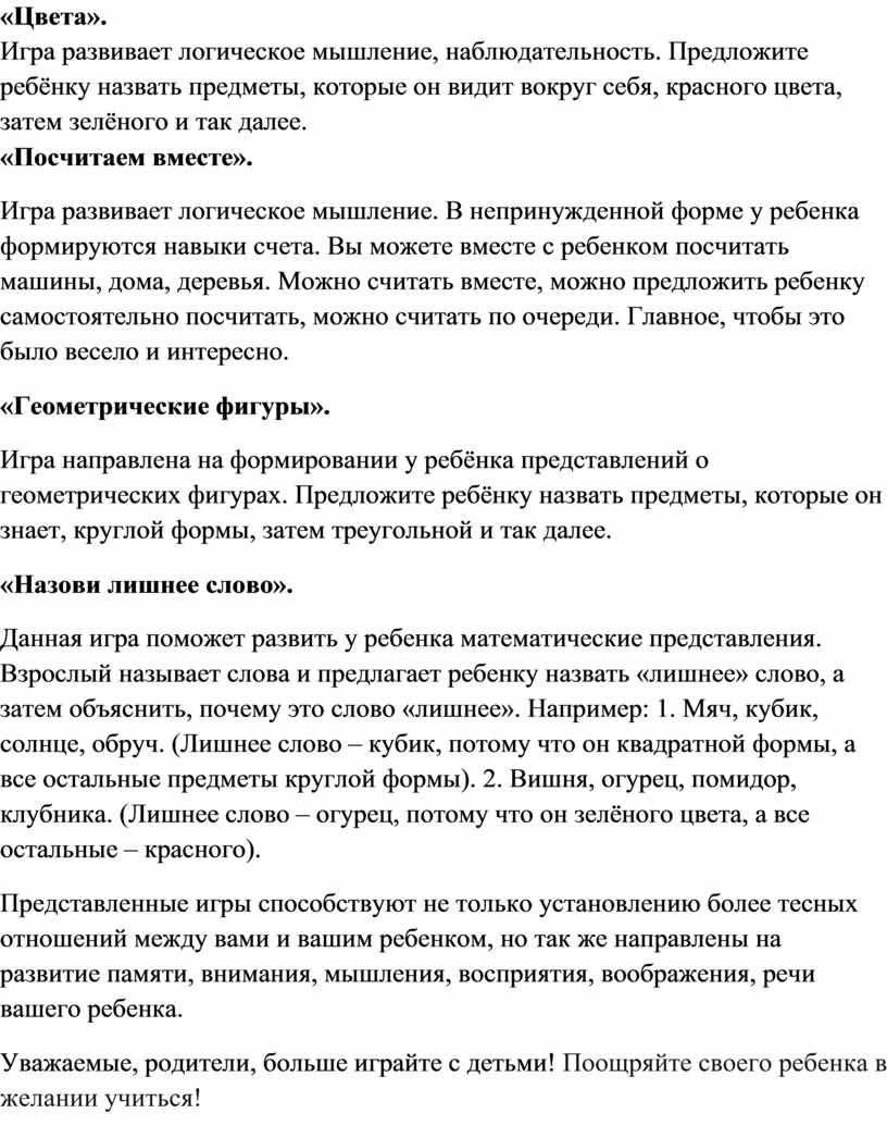 Данная игра поможет развить у ребенка математические представления. Взрослый называет слова и предлагает ребенку назвать «лишнее» слово, а затем объяснить, почему это слово «лишнее». Например: 1. Мяч, кубик, солнце, обруч. (Лишнее слово – кубик, потому что он квадратной формы, а все остальные предметы круглой формы). 2. Вишня, огурец, помидор, клубника. (Лишнее слово – огурец, потому что он зелёного цвета, а все остальные – красного).