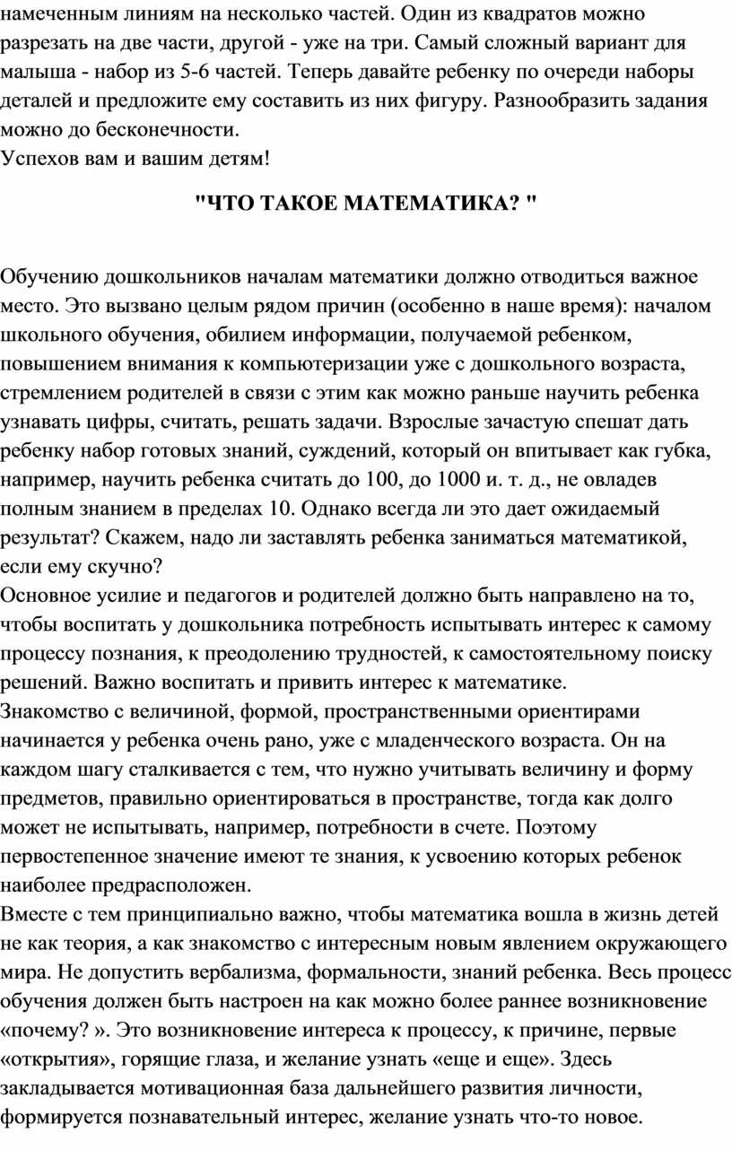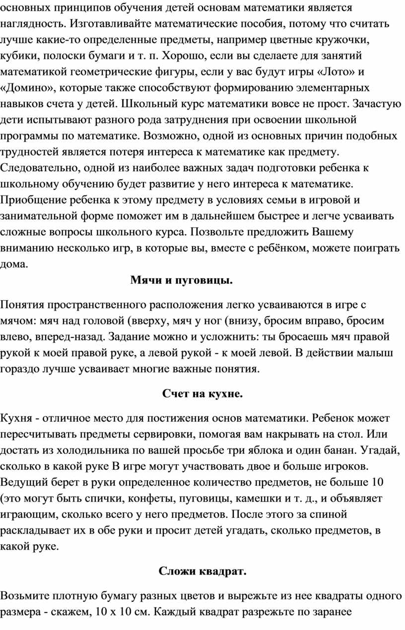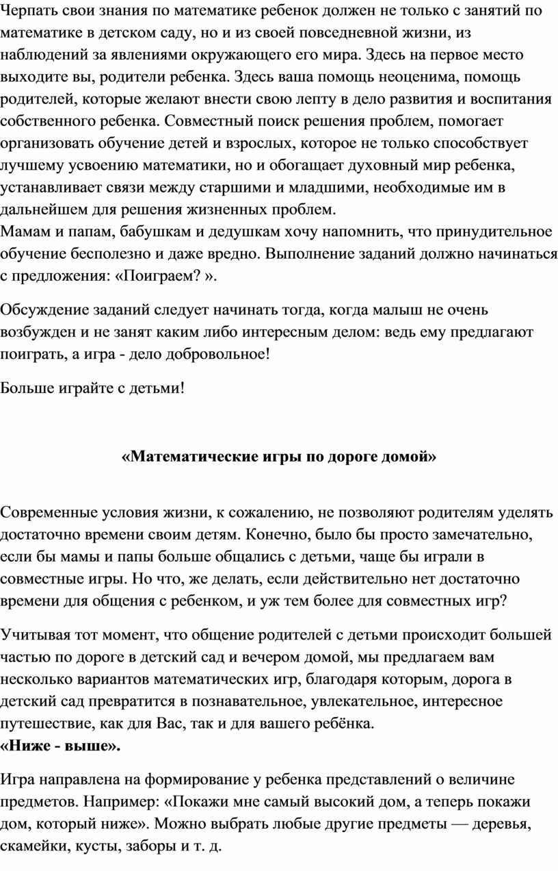 математике. Приобщение ребенка к этому предмету в условиях семьи в игровой и