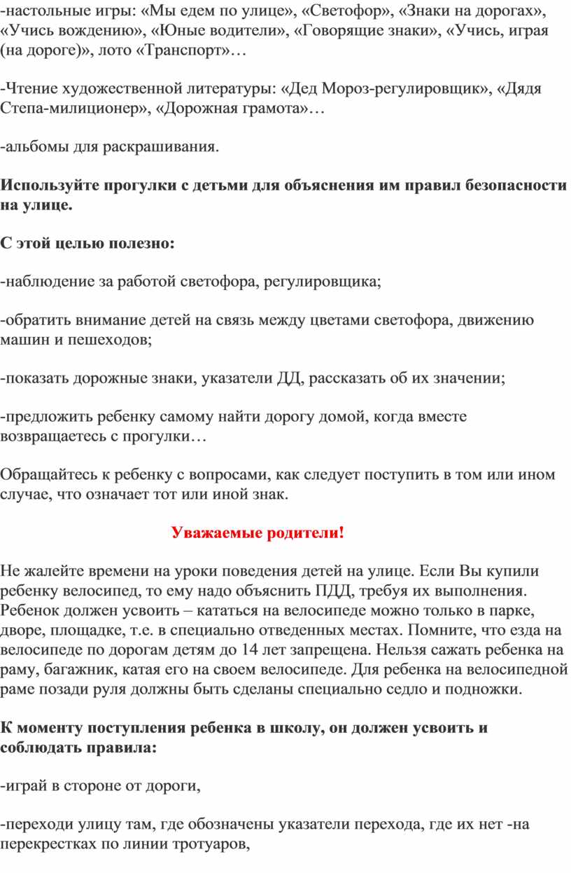 -настольные игры: «Мы едем по улице», «Светофор», «Знаки на дорогах», «Учись вождению», «Юные водители», «Говорящие знаки», «Учись, играя (на дороге)», лото «Транспорт»…