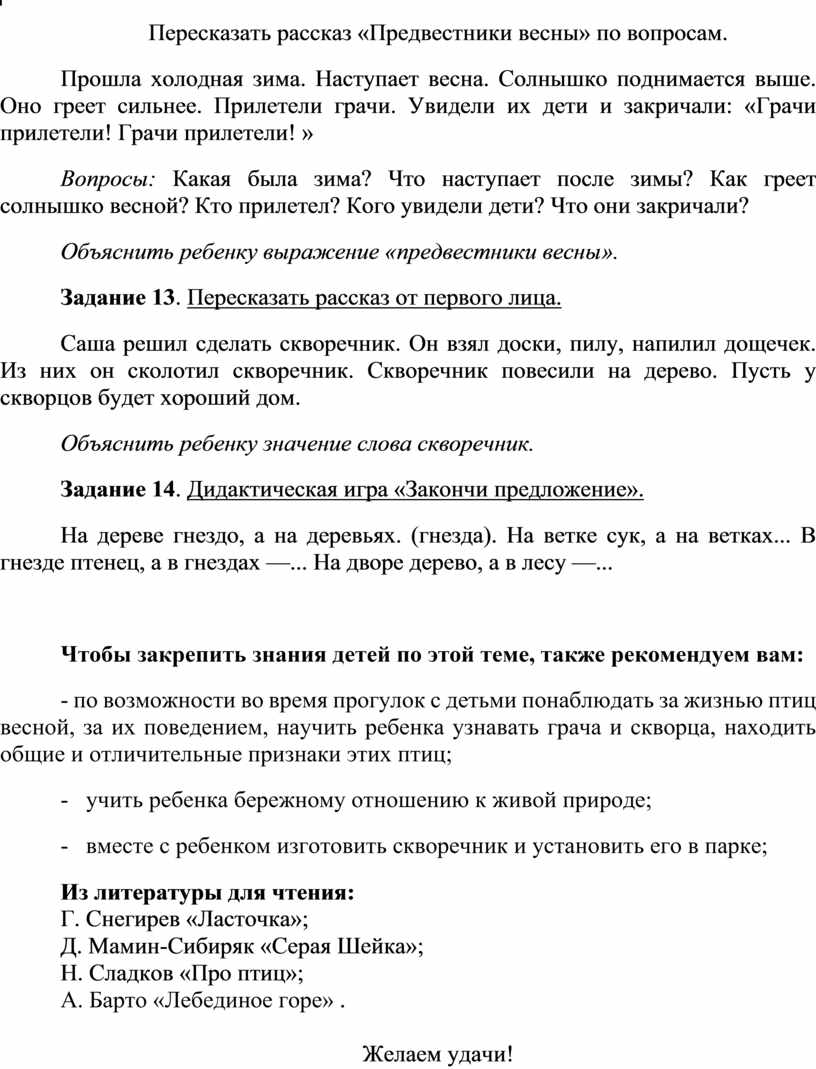 Задание 12. Пересказать рассказ «Прилетели грачи» по вопросам.