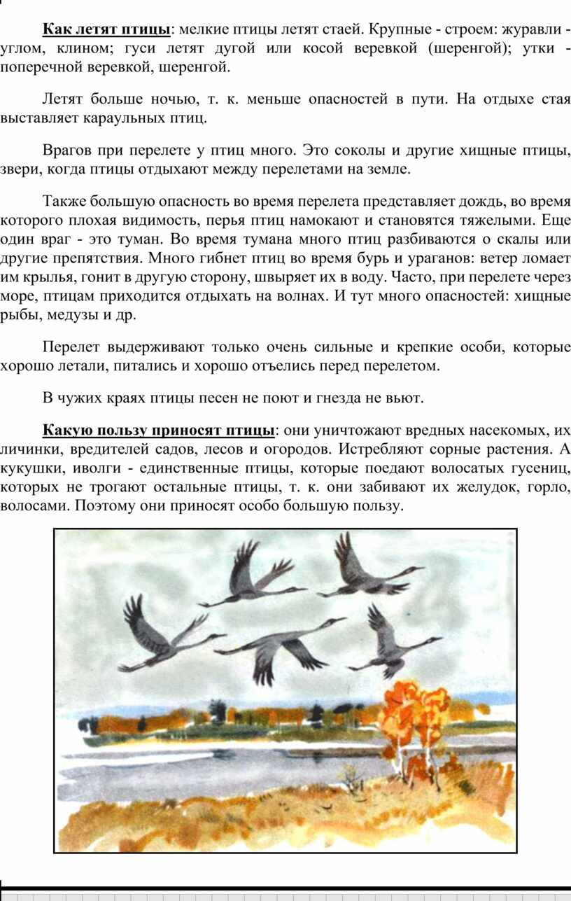 Как летят птицы: мелкие птицы летят стаей. Крупные - строем: журавли - углом, клином; гуси летят дугой или косой веревкой (шеренгой); утки - поперечной веревкой, шеренгой.