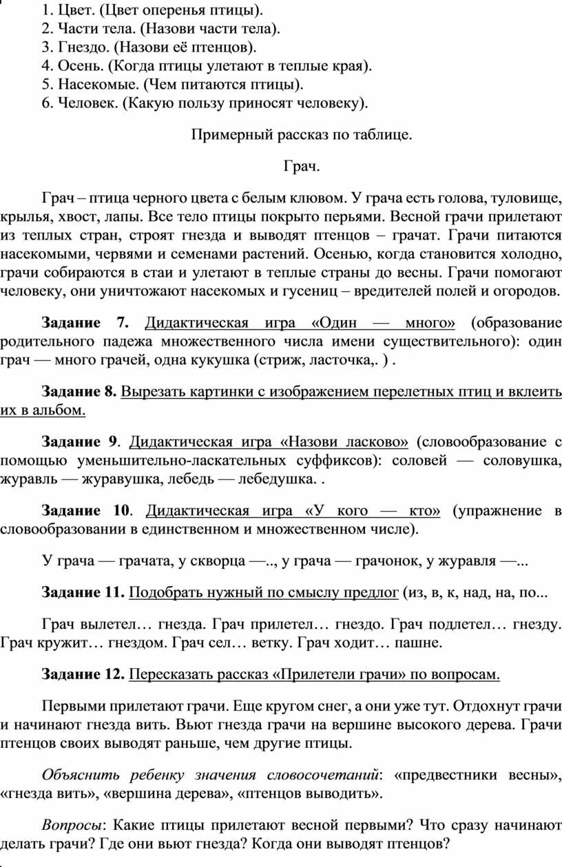 Задание 7. Дидактическая игра «Один — много» (образование родительного падежа множественного числа имени существительного): один грач — много грачей, одна кукушка (стриж, ласточка,. ) .