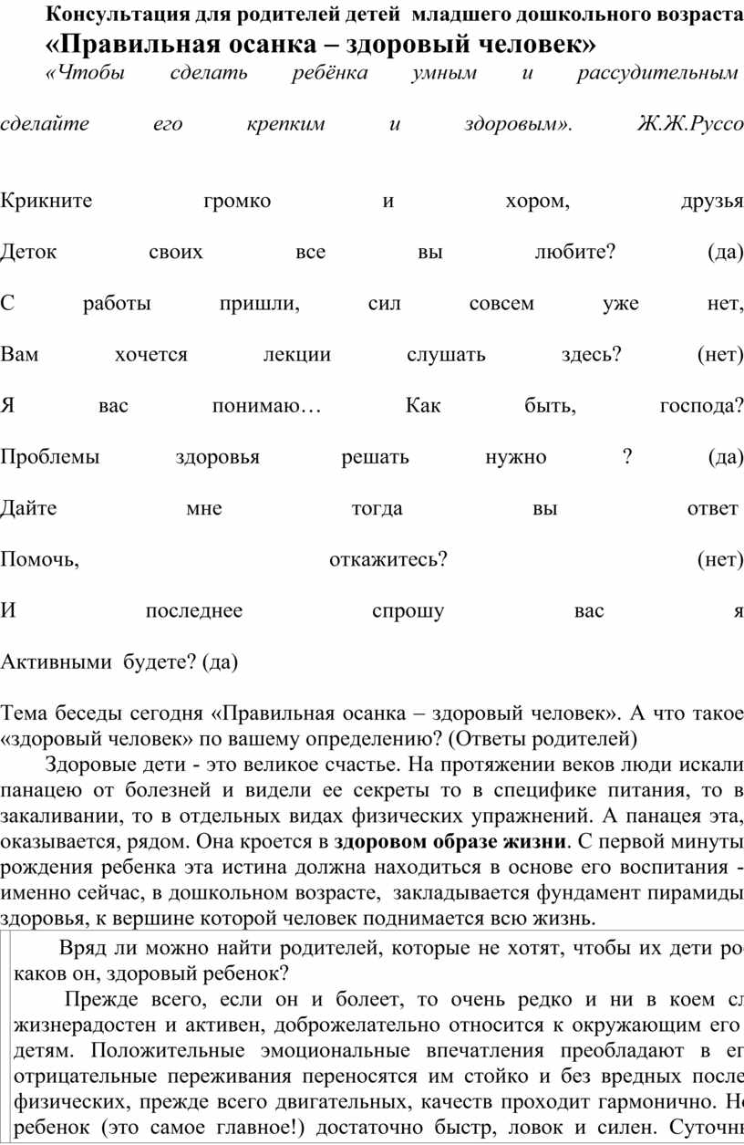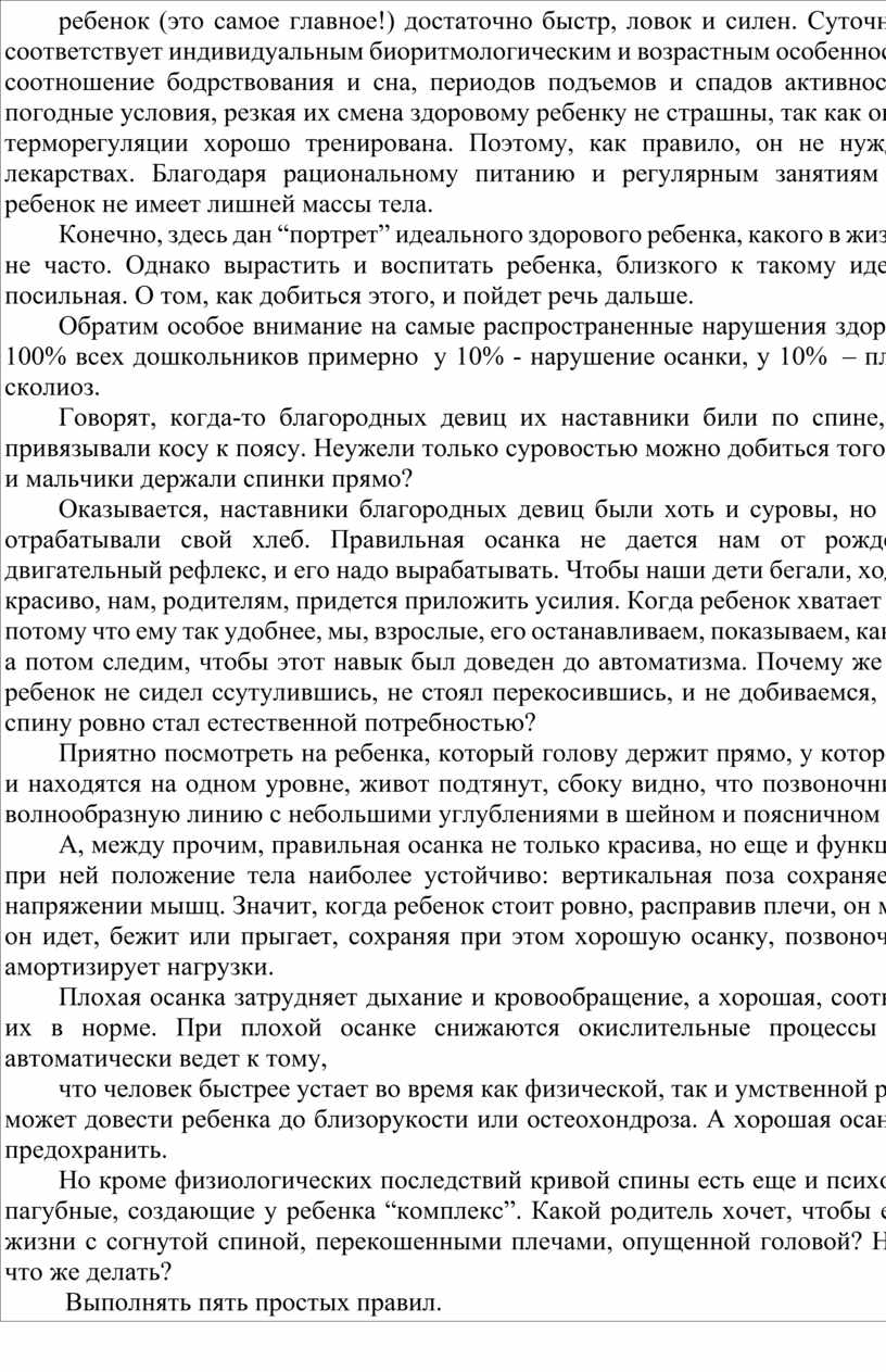 Вряд ли можно найти родителей, которые не хотят, чтобы их дети росли здоровыми. Ну, а каков он, здоровый ребенок? Прежде всего, если он и болеет, то очень редко и ни в коем случае не тяжело. Он жизнерадостен и активен, доброжелательно относится к окружающим его людям – взрослым и детям. Положительные эмоциональные впечатления преобладают в его жизни, тогда как отрицательные переживания переносятся им стойко и без вредных последствий. Развитие его физических, прежде всего двигательных, качеств проходит гармонично. Нормальный, здоровый ребенок (это самое главное!) достаточно быстр, ловок и силен. Суточный режим его жизни соответствует индивидуальным биоритмологическим и возрастным особенностям: это оптимальное соотношение бодрствования и сна, периодов подъемов и спадов активности. Неблагоприятные погодные условия, резкая их смена здоровому ребенку не страшны, так как он закален, его система терморегуляции хорошо тренирована. Поэтому, как правило, он не нуждается в каких либо лекарствах. Благодаря рациональному питанию и регулярным занятиям физкультурой такой ребенок не имеет лишней массы тела. Конечно, здесь дан “портрет” идеального здорового ребенка, какого в жизни сегодня встретишь не часто. Однако вырастить и воспитать ребенка, близкого к такому идеалу, - задача вполне посильная. О том, как добиться этого, и пойдет речь дальше. Обратим особое внимание на самые распространенные нарушения здоровья наших детей. Из 100% всех дошкольников примерно у 10% - нарушение осанки, у 10% – плоскостопие, у 10% – сколиоз. Говорят, когда-то благородных девиц их наставники били по спине, если те сутулились, привязывали косу к поясу. Неужели только суровостью можно добиться того, чтобы наши девочки и мальчики держали спинки прямо? Оказывается, наставники благородных девиц были хоть и суровы, но прозорливы и честно отрабатывали свой хлеб. Правильная осанка не дается нам от рождения. Это условный двигательный рефлекс, и его надо вырабатывать. Чтобы наши дети бегали, ходили, стояли и сидели красиво, нам, родителям, придется приложить усилия. Когда ребенок хватает еду с тарелки руками, потому что ему так удобнее, мы, взрослые, его останавливаем, показываем, как надо правильно есть, а потом следим, чтобы этот навык был доведен до автоматизма. Почему же мы не следим, чтобы ребенок не сидел ссутулившись, не стоял перекосившись, и не добиваемся, чтобы навык держать спину ровно стал естественной потребностью? Приятно посмотреть на ребенка, который голову держит прямо, у которого плечи развернуты и находятся на одном уровне, живот подтянут, сбоку видно, что позвоночник образует красивую волнообразную линию с небольшими углублениями в шейном и поясничном отделах. А, между прочим, правильная осанка не только красива, но еще и функциональна, потому что при ней положение тела наиболее устойчиво: вертикальная поза сохраняется при наименьшем напряжении мышц. Значит, когда ребенок стоит ровно, расправив плечи, он меньше устает. А если он идет, бежит или прыгает, сохраняя при этом хорошую осанку, позвоночник лучшим образом амортизирует нагрузки. Плохая осанка затрудняет дыхание и кровообращение, а хорошая, соответственно, сохраняет их в норме. При плохой осанке снижаются окислительные процессы в организме, а это автоматически ведет к тому, что человек быстрее устае