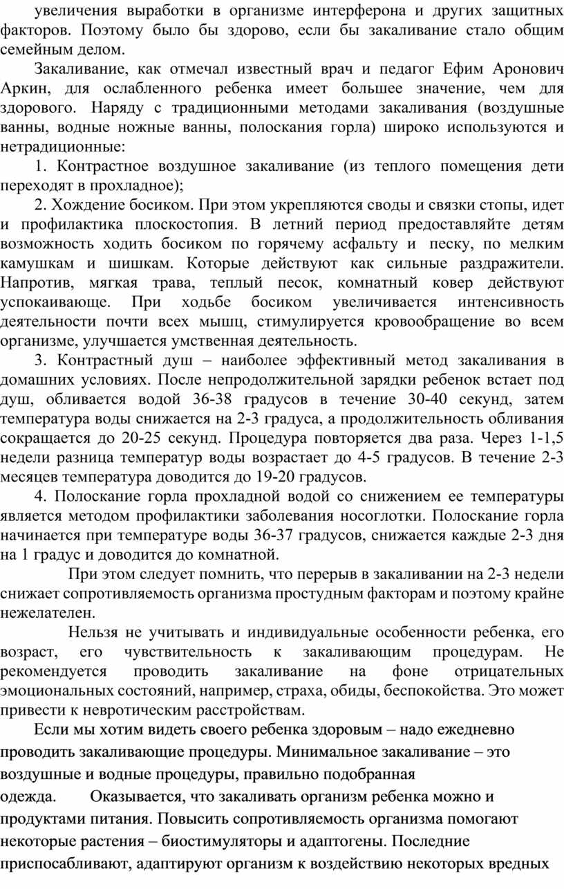 Закаливание, как отмечал известный врач и педагог Ефим Аронович Аркин, для ослабленного ребенка имеет большее значение, чем для здорового. Наряду с традиционными методами закаливания (воздушные ванны, водные ножные ванны, полоскания горла) широко используются и нетрадиционные: