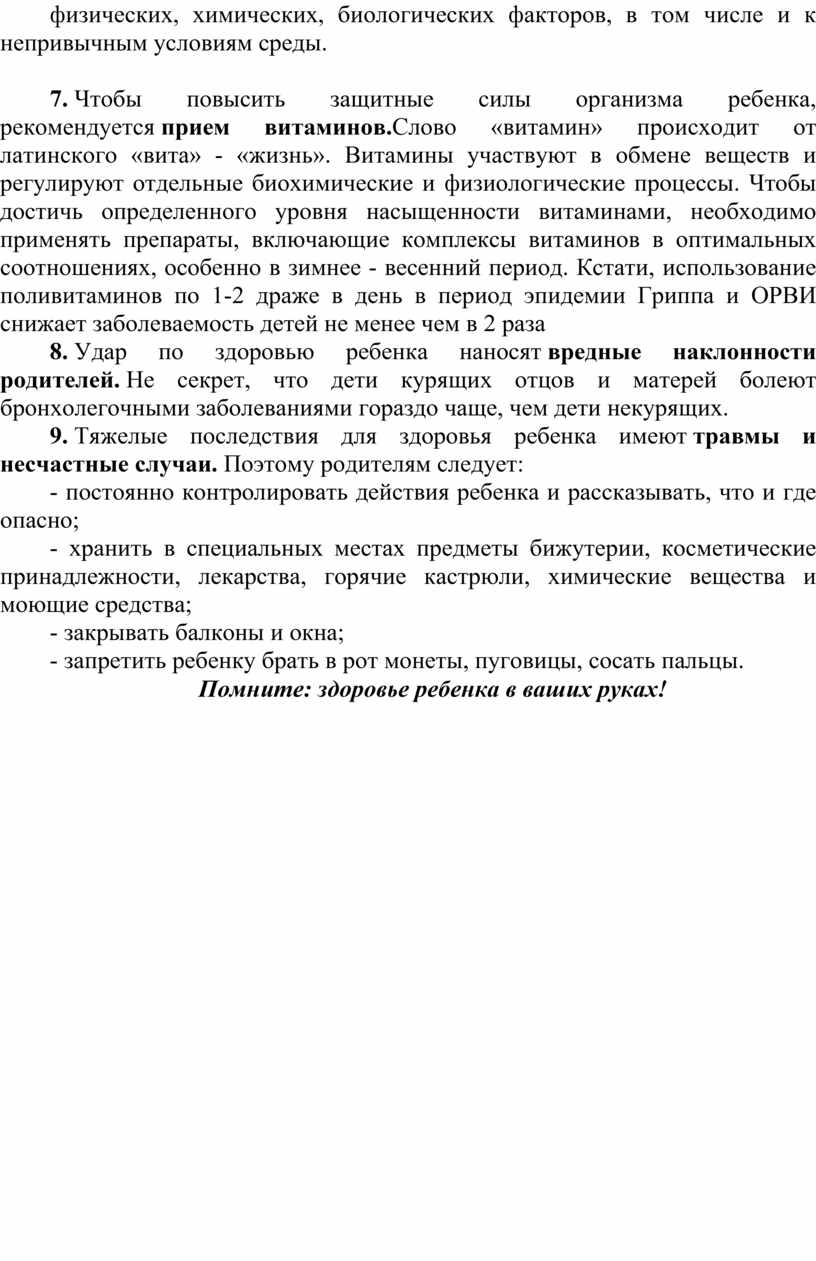 9. Тяжелые последствия для здоровья ребенка имеют травмы и несчастные случаи. Поэтому родителям следует: