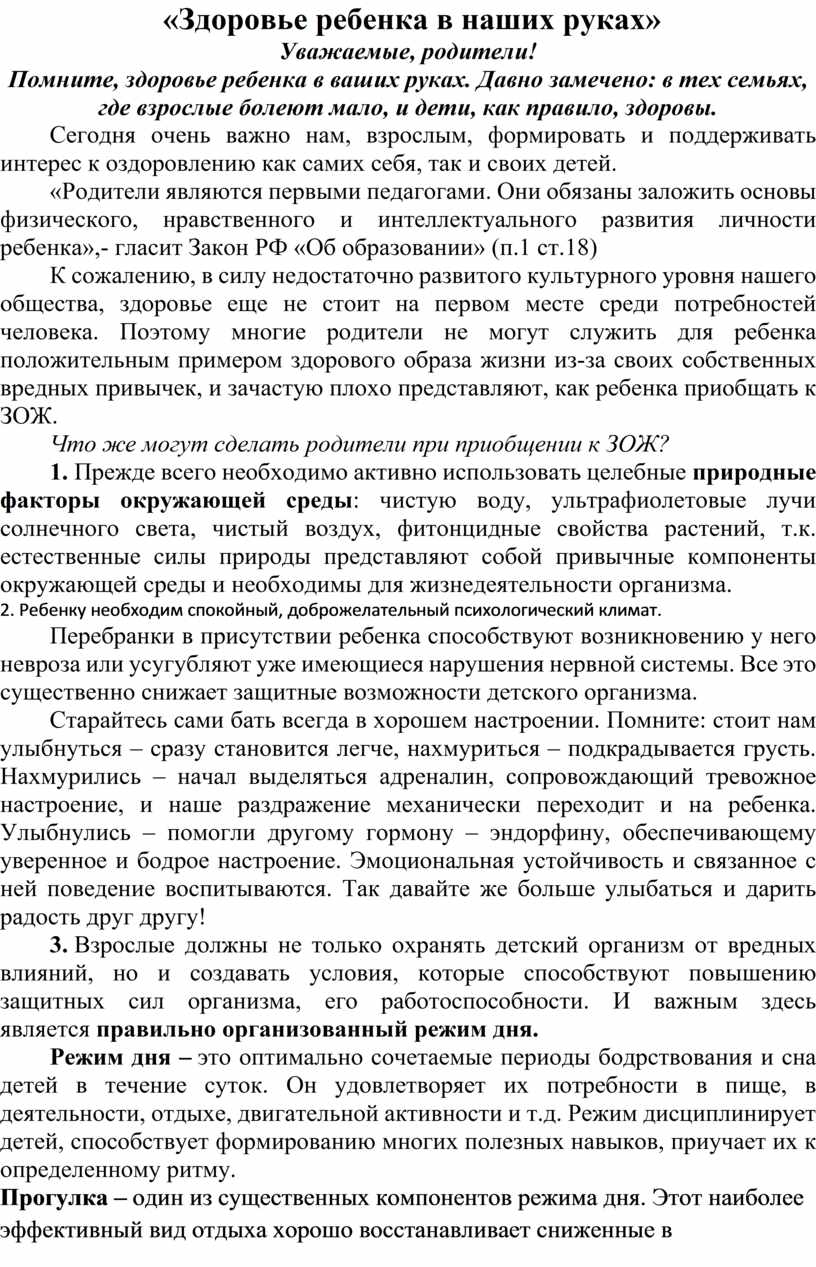 «Родители являются первыми педагогами. Они обязаны заложить основы физического, нравственного и интеллектуального развития личности ребенка»,- гласит Закон РФ «Об образовании» (п.1 ст.18)