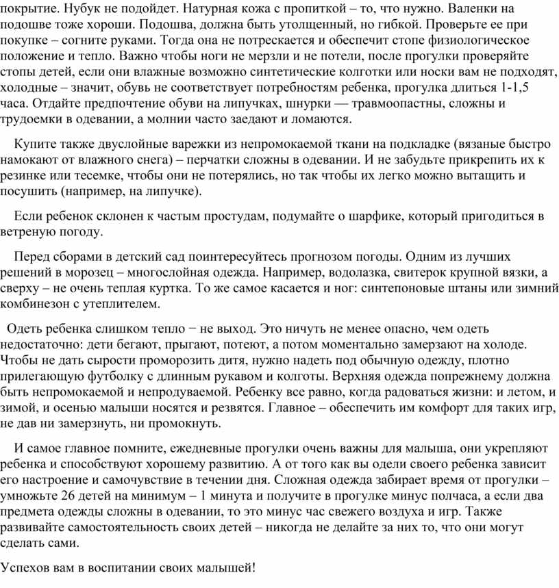 И самое главное помните, ежедневные прогулки очень важны для малыша, они укрепляют ребенка и способствуют хорошему развитию. А от того как вы одели своего ребенка зависит его настроение и самочувствие в течении дня. Сложная одежда забирает время от прогулки – умножьте 26 детей на минимум – 1 минута и получите в прогулке минус полчаса, а если два предмета одежды сложны в одевании, то это минус час свежего воздуха и игр. Также развивайте самостоятельность своих детей – никогда не делайте за них то, что они могут сделать сами.