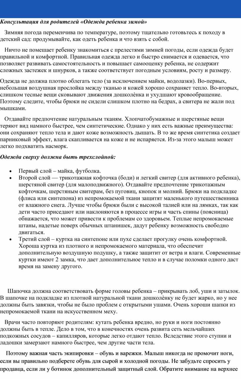Одежда не должна плотно облегать тело (за исключением майки, водолазки). Во-первых, небольшая воздушная прослойка между тканью и кожей хорошо сохраняет тепло. Во-вторых, слишком тесные вещи сковывают движения дошколѐнка и ухудшают кровообращение. Поэтому следите, чтобы брюки не сидели слишком плотно на бедрах, а свитера не жали под мышками.