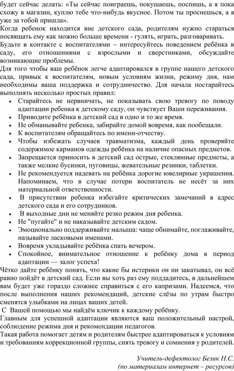 Наша с вами задача сократить время адаптации ребенка, помочь ему максимально быстро включиться в коррекционную работу, привыкнуть к требованиям группы, режиму работы.