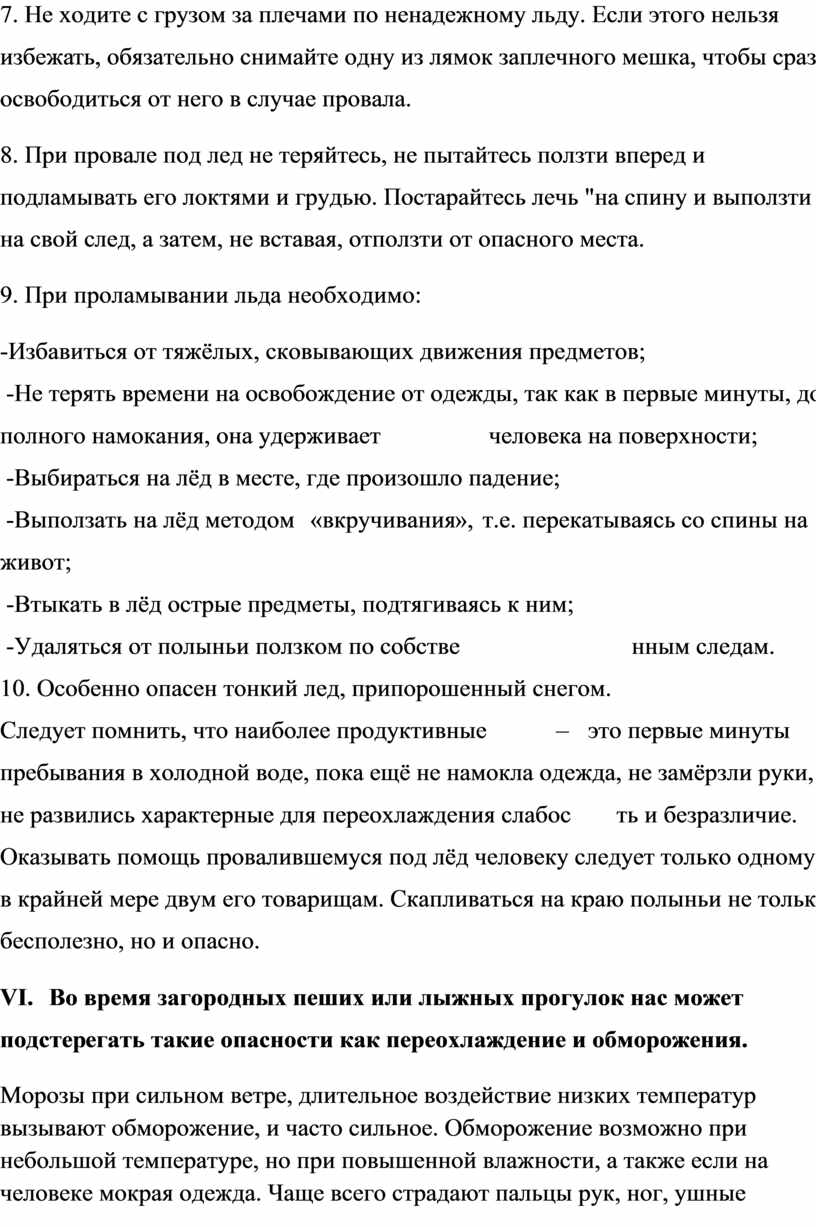VI. Во время загородных пеших или лыжных прогулок нас может подстерегать такие опасности как переохлаждение и обморожения.