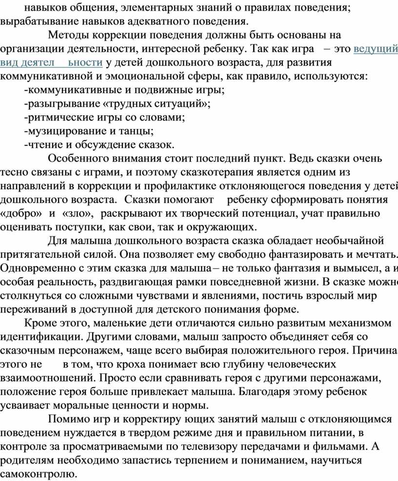 Особенного внимания стоит последний пункт. Ведь сказки очень тесно связаны с играми, и поэтому сказкотерапия является одним из направлений в коррекции и профилактике отклоняющегося поведения у детей дошкольного возраста. Сказки помогают ребенку сформировать понятия «добро» и «зло», раскрывают их творческий потенциал, учат правильно оценивать поступки, как свои, так и окружающих.