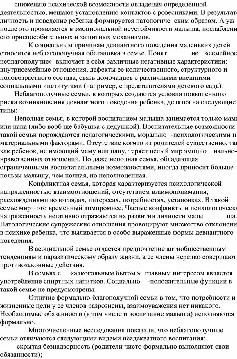К социальным причинам девиантного поведения маленьких детей относится неблагополучная обстановка в семье. Понятие «семейное неблагополучие» включает в себя различные негативные характеристики: внутрисемейные отношения, дефекты ее количественного, структурного и половозрастного состава, связь домочадцев с различными внешними социальными институтами (например, с представителями детского сада).