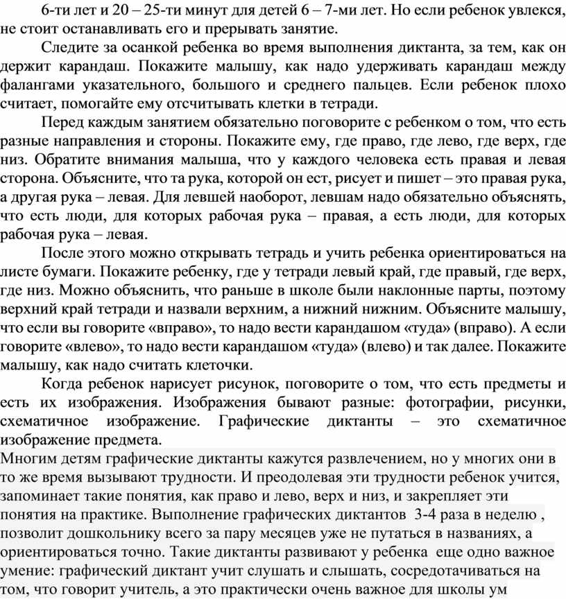 Продолжительность одного занятия с графическими диктантами не должна превышать 10 – 15 минут для детей 5-ти лет, 15 – 20 минут для детей 5 – 6-ти лет и 20 – 25-ти минут для детей 6 – 7-ми лет. Но если ребенок увлекся, не стоит останавливать его и прерывать занятие.