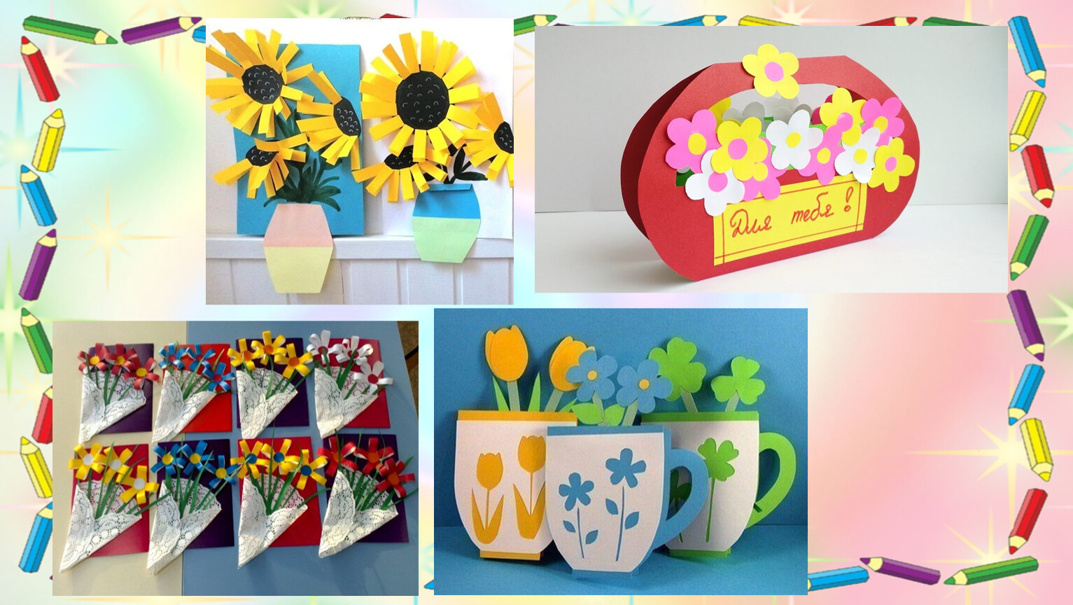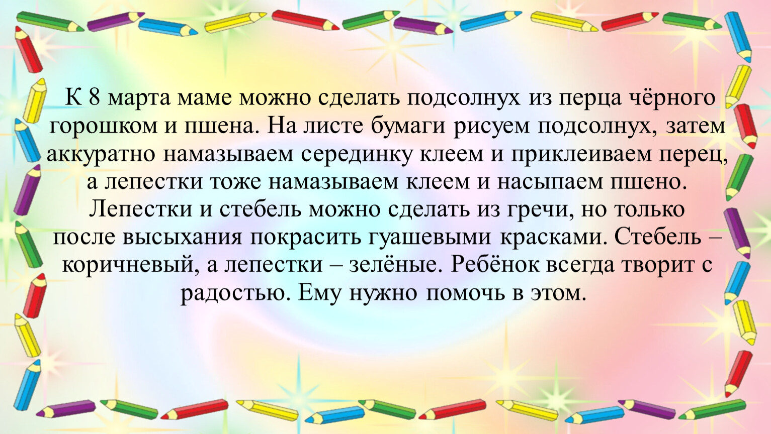 К 8 марта маме можно сделать подсолнух из перца чёрного горошком и пшена. На листе бумаги рисуем подсолнух, затем аккуратно намазываем серединку клеем и приклеиваем перец, а лепестки тоже намазываем клеем и насыпаем пшено. Лепестки и стебель можно сделать из гречи, но толькопосле высыхания покрасить гуашевыми красками. Стебель – коричневый, а лепестки – зелёные. Ребёнок всегда творит с радостью. Ему нужно помочь в этом.