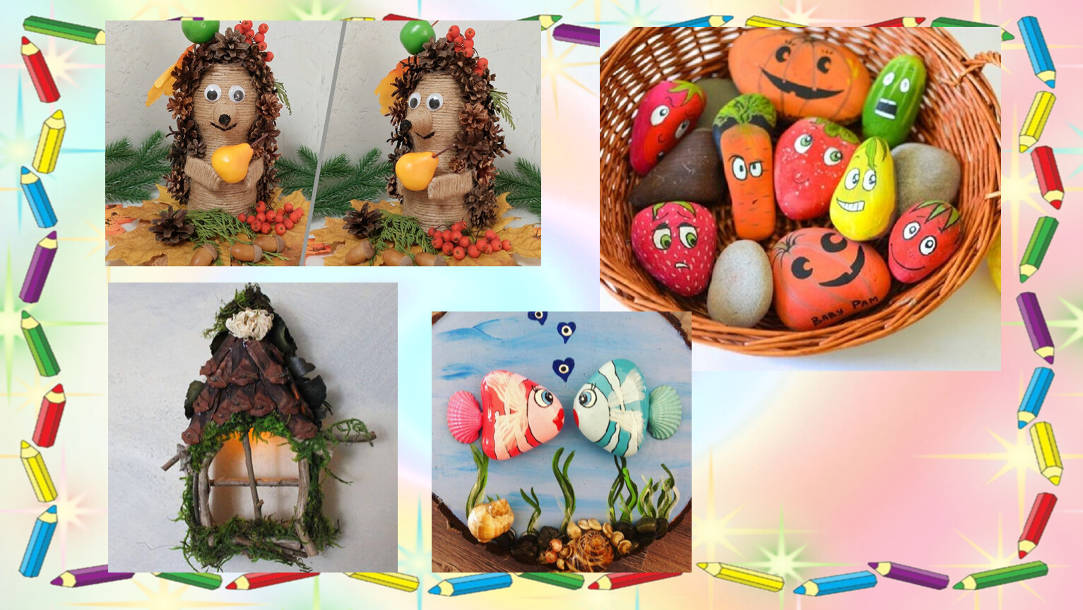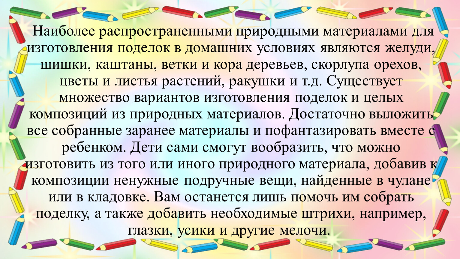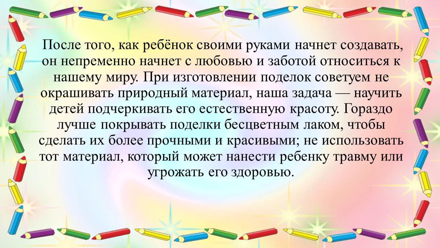 После того, как ребёнок своими руками начнет создавать, он непременно начнет с любовью и заботой относиться к нашему миру. При изготовлении поделок советуем не окрашивать природный материал, наша задача — научить детей подчеркивать его естественную красоту. Гораздо лучше покрывать поделки бесцветным лаком, чтобы сделать их более прочными и красивыми; не использовать тот материал, который может нанести ребенку травму или угрожать его здоровью.