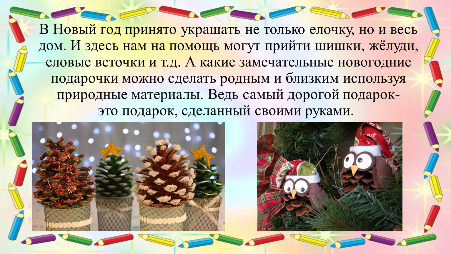 В Новый год принято украшать не только елочку, но и весь дом. И здесь нам на помощь могут прийти шишки, жёлуди, еловые веточки и т.д. А какие замечательные новогодние подарочки можно сделать родным и близким используя природные материалы. Ведь самый дорогой подарок-это подарок, сделанный своими руками.