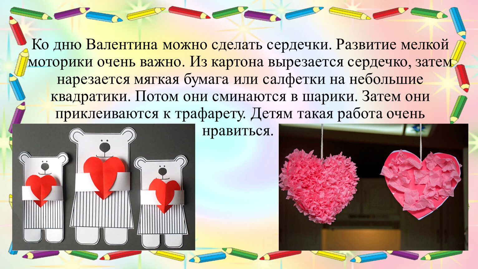 Ко дню Валентина можно сделать сердечки. Развитие мелкой моторики очень важно. Из картона вырезается сердечко, затем нарезается мягкая бумага или салфетки на небольшие квадратики. Потом они сминаются в шарики. Затем они приклеиваются к трафарету. Детям такая работа очень нравиться.