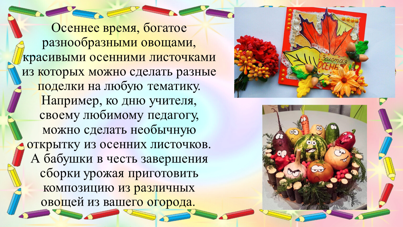 Осеннее время, богатое разнообразными овощами, красивыми осенними листочками из которых можно сделать разные поделки на любую тематику. Например, ко дню учителя, своему любимому педагогу, можно сделать необычную открытку из осенних листочков. А бабушки в честь завершения сборки урожая приготовить композицию из различных овощей из вашего огорода.