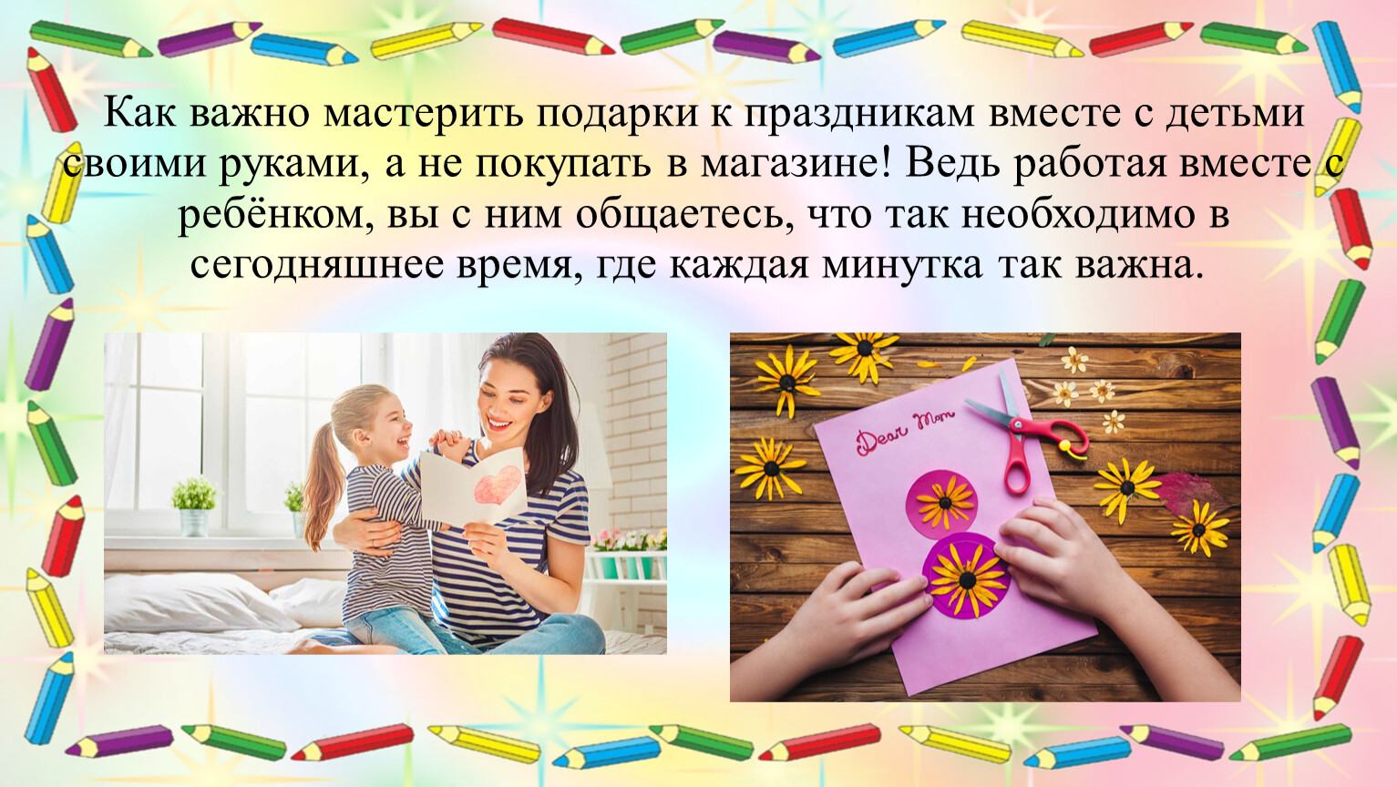 Как важно мастерить подарки к праздникам вместе с детьми своими руками, а не покупать в магазине! Ведь работая вместе с ребёнком, вы с ним общаетесь, что так необходимо в сегодняшнее время, где каждая минутка так важна.