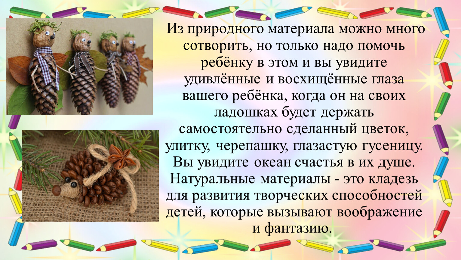 Из природного материала можно много сотворить, но только надо помочь ребёнку в этом и вы увидите удивлённые и восхищённые глаза вашего ребёнка, когда он на своих ладошках будет держать самостоятельно сделанный цветок, улитку, черепашку, глазастую гусеницу. Вы увидите океан счастья в их душе. Натуральные материалы - это кладезь для развития творческих способностей детей, которые вызывают воображение и фантазию.