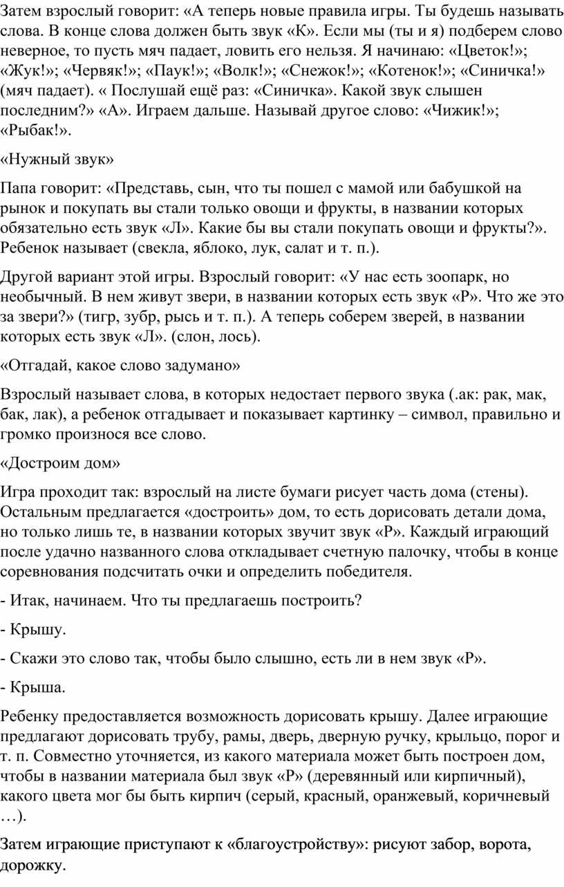 Игра проходит так: взрослый на листе бумаги рисует часть дома (стены). Остальным предлагается «достроить» дом, то есть дорисовать детали дома, но только лишь те, в названии которых звучит звук «Р». Каждый играющий после удачно названного слова откладывает счетную палочку, чтобы в конце соревнования подсчитать очки и определить победителя.