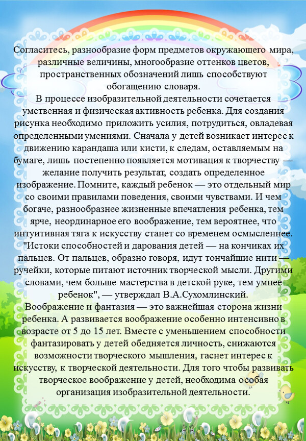 Согласитесь, разнообразие форм предметов окружающего мира, различные величины, многообразие оттенков цветов, пространственных обозначений лишь способствуют обогащению словаря.В процессе изобразительной деятельности сочетается умственная и физическая активность ребенка. Для создания рисунка необходимо приложить усилия, потрудиться, овладевая определенными умениями. Сначала у детей возникает интерес к движению карандаша или кисти, к следам, оставляемым на бумаге, лишь постепенно появляется мотивация к творчеству — желание получить результат, создать определенное изображение. Помните, каждый ребенок — это отдельный мир со своими правилами поведения, своими чувствами. И чем богаче, разнообразнее жизненные впечатления ребенка, тем ярче, неординарное его воображение, тем вероятнее, что интуитивная тяга к искусству станет со временем осмысленнее. "Истоки способностей и дарования детей — на кончиках их пальцев. От пальцев, образно говоря, идут тончайшие нити — ручейки, которые питают источник творческой мысли. Другими словами, чем больше мастерства в детской руке, тем умнее ребенок", — утверждал В.А.Сухомлинский.Воображение и фантазия — это важнейшая сторона жизни ребенка. А развивается воображение особенно интенсивно в возрасте от 5 до 15 лет. Вместе с уменьшением способности фантазировать у детей обедняется личность, снижаются возможности творческого мышления, гаснет интерес к искусству, к творческой деятельности. Для того чтобы развивать творческое воображение у детей, необходима особая организация изобразительной деятельности.