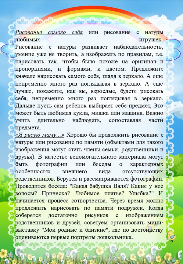 «Я рисую маму…» Хорошо бы продолжить рисование с натуры или рисование по памяти (объектами для такого изображения могут стать члены семьи, родственники и друзья). В качестве вспомогательного материала могут быть фотографии или беседы о характерных особенностях внешнего вида отсутствующих родственников. Берутся и рассматриваются фотографии. Проводится беседа: "Какая бабушка Валя? Какие у нее волосы? Прическа? Любимое платье? Улыбка?" И начинается процесс сотворчества. Через время можно предложить нарисовать по памяти подружек. Когда соберется достаточно рисунков с изображением родственников и друзей, советуем организовать мини-выставку "Мои родные и близкие", где по достоинству оцениваются первые портреты дошкольника.