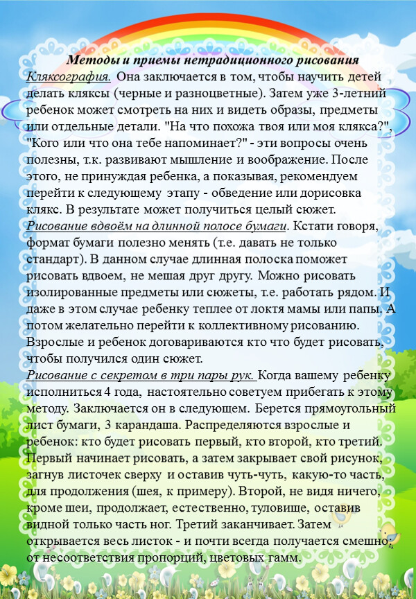 Кляксография. Она заключается в том, чтобы научить детей делать кляксы (черные и разноцветные). Затем уже 3-летний ребенок может смотреть на них и видеть образы, предметы или отдельные детали. "На что похожа твоя или моя клякса?", "Кого или что она тебе напоминает?" - эти вопросы очень полезны, т.к. развивают мышление и воображение. После этого, не принуждая ребенка, а показывая, рекомендуем перейти к следующему этапу - обведение или дорисовка клякс. В результате может получиться целый сюжет.