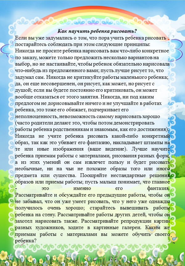 Если вы уже задумались о том, что пора учить ребенка рисовать постарайтесь соблюдать при этом следующие принципы:Никогда не просите ребенка нарисовать вам что-либо конкретное по заказу, можете только предложить несколько вариантов на выбор, но не настаивайте, чтобы ребенок обязательно нарисовала что-нибудь из предложенного вами; пусть лучше рисует то, что задумал сам. Никогда не критикуйте работы маленького ребенка; да, он еще несовершенен, он рисует, как может, но рисует с душой; если вы будете постоянно его критиковать, он может вообще отказаться от этого занятия. Никогда, ни под каким предлогом не дорисовывайте ничего и не улучшайте в работах ребенка, это тоже его обижает, подчеркивает его неполноценность, невозможность самому нарисовать хорошо (часто родители делают это, чтобы потом демонстрировать работы ребенка родственникам и знакомым, как его достижения).