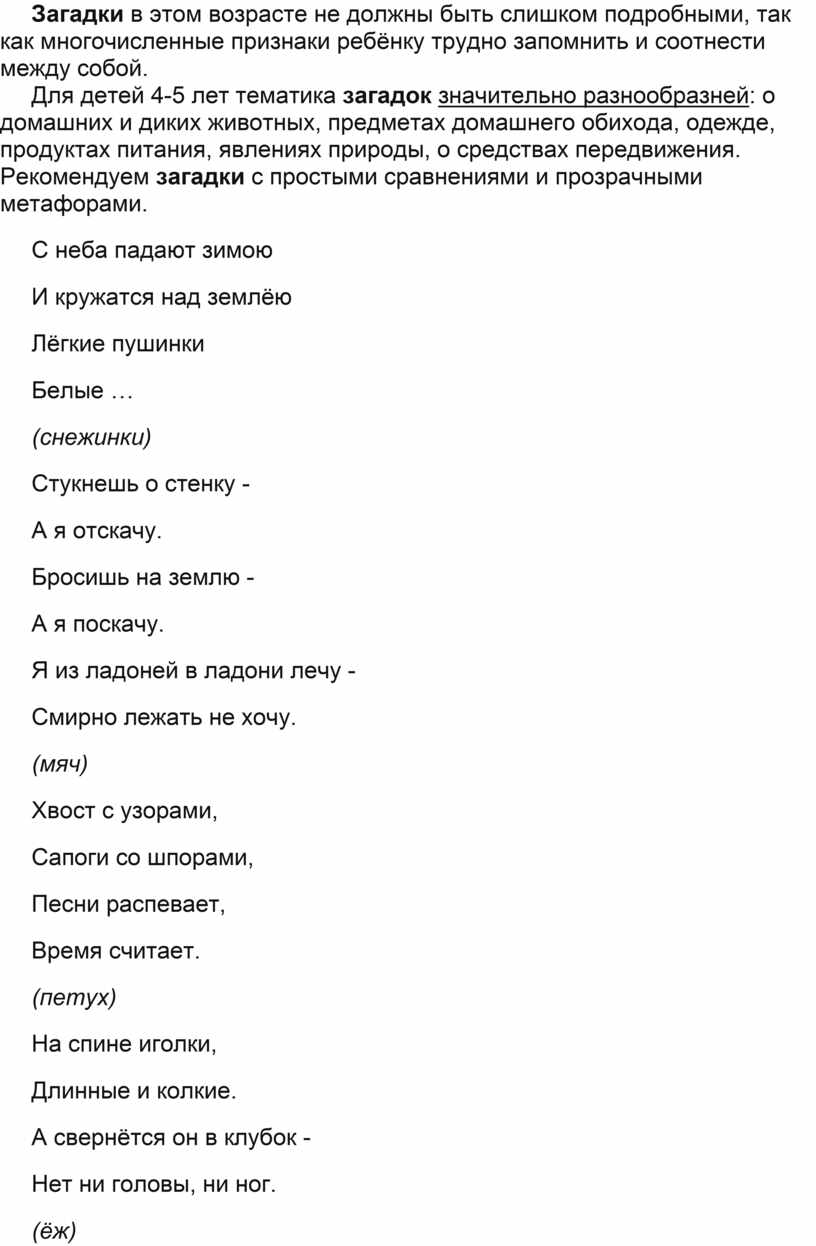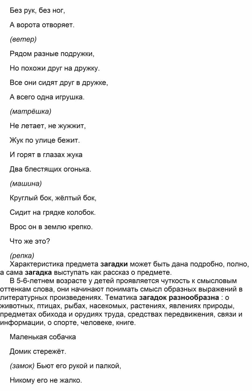 В 5-6-летнем возрасте у детей проявляется чуткость к смысловым оттенкам слова, они начинают понимать смысл образных выражений в литературных произведениях. Тематика загадок разнообразна : о животных, птицах, рыбах, насекомых, растениях, явлениях природы, предметах обихода и орудиях труда, средствах передвижения, связи и информации, о спорте, человеке, книге.