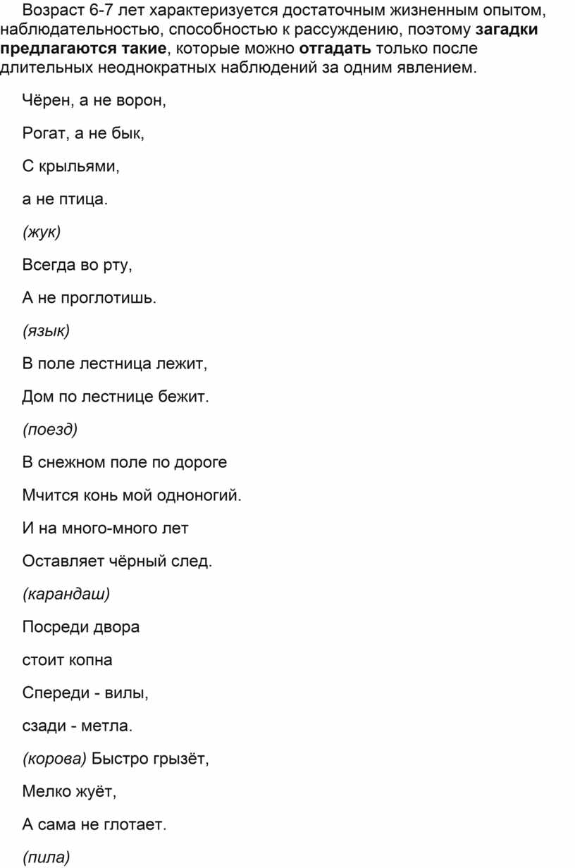 Возраст 6-7 лет характеризуется достаточным жизненным опытом, наблюдательностью, способностью к рассуждению, поэтому загадки предлагаются такие, которые можно отгадать только после длительных неоднократных наблюдений за одним явлением.