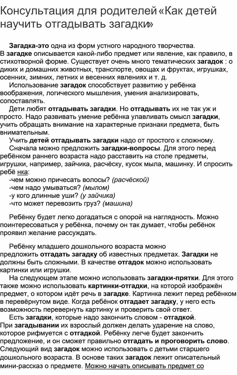 Консультация для родителей «Как детей научить отгадывать загадки»