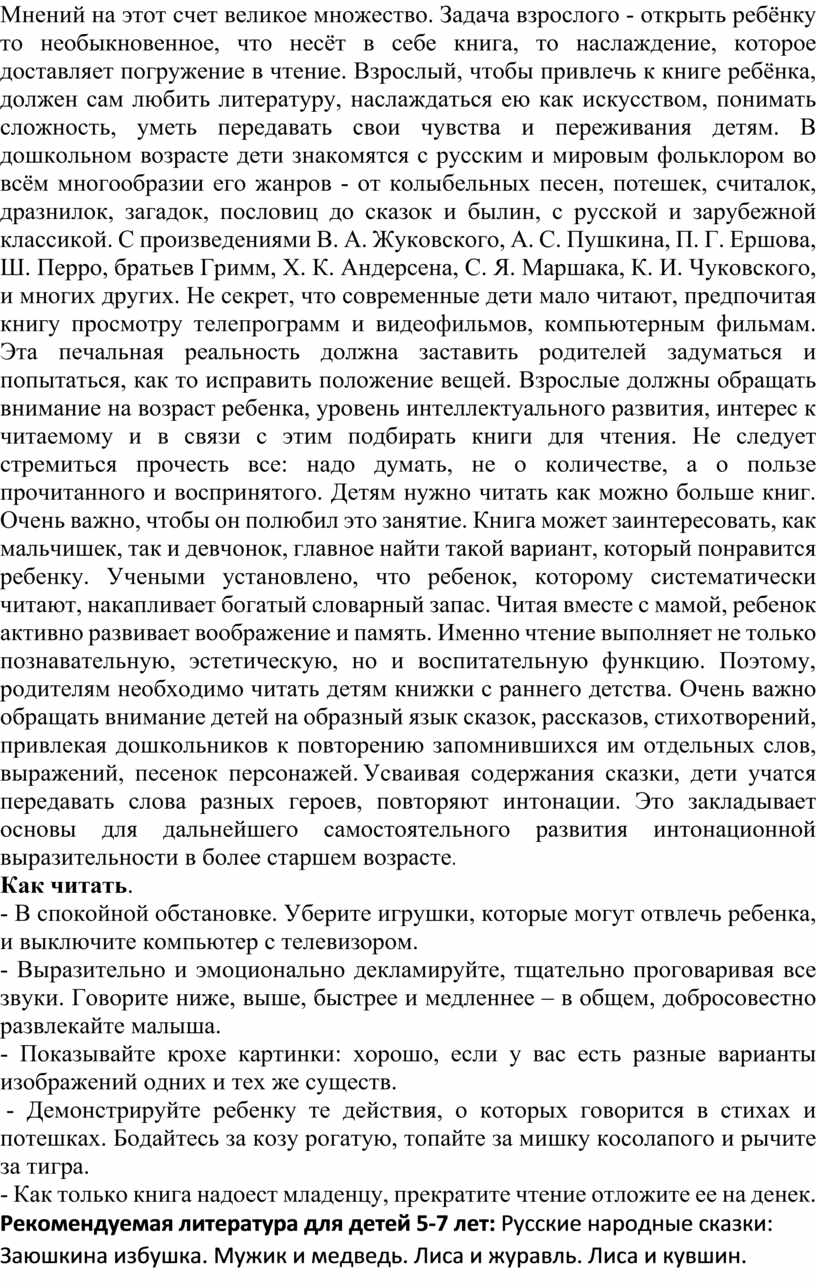 Цель: формирование интереса и любви к художественной литературе. Многие родители задаются вопросом, что читать детям в том или ином возрасте. Мнений на этот счет великое множество. Задача взрослого - открыть ребёнку то необыкновенное, что несёт в себе книга, то наслаждение, которое доставляет погружение в чтение. Взрослый, чтобы привлечь к книге ребёнка, должен сам любить литературу, наслаждаться ею как искусством, понимать сложность, уметь передавать свои чувства и переживания детям. В дошкольном возрасте дети знакомятся с русским и мировым фольклором во всём многообразии его жанров - от колыбельных песен, потешек, считалок, дразнилок, загадок, пословиц до сказок и былин, с русской и зарубежной классикой. С произведениями В. А. Жуковского, А. С. Пушкина, П. Г. Ершова, Ш. Перро, братьев Гримм, Х. К. Андерсена, С. Я. Маршака, К. И. Чуковского, и многих других. Не секрет, что современные дети мало читают, предпочитая книгу просмотру телепрограмм и видеофильмов, компьютерным фильмам. Эта печальная реальность должна заставить родителей задуматься и попытаться, как то исправить положение вещей. Взрослые должны обращать внимание на возраст ребенка, уровень интеллектуального развития, интерес к читаемому и в связи с этим подбирать книги для чтения. Не следует стремиться прочесть все: надо думать, не о количестве, а о пользе прочитанного и воспринятого. Детям нужно читать как можно больше книг. Очень важно, чтобы он полюбил это занятие. Книга может заинтересовать, как мальчишек, так и девчонок, главное найти такой вариант, который понравится ребенку. Учеными установлено, что ребенок, которому систематически читают, накапливает богатый словарный запас. Читая вместе с мамой, ребенок активно развивает воображение и память. Именно чтение выполняет не только познавательную, эстетическую, но и воспитательную функцию. Поэтому, родителям необходимо читать детям книжки с раннего детства. Очень важно обращать внимание детей на образный язык сказок, рассказов, стихотворений, привлекая дошкольников к повторению запомнившихся им отдельных слов, выражений, песенок персонажей. Усваивая содержания сказки, дети учатся передавать слова разных героев, повторяют интонации. Это закладывает основы для дальнейшего самостоятельного развития интонационной выразительности в более старшем возрасте.