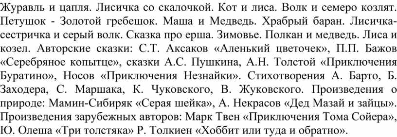 Рекомендуемая литература для детей 5-7 лет: Русские народные сказки: Заюшкина избушка. Мужик и медведь. Лиса и журавль. Лиса и кувшин. Журавль и цапля. Лисичка со скалочкой. Кот и лиса. Волк и семеро козлят. Петушок - Золотой гребешок. Маша и Медведь. Храбрый баран. Лисичка-сестричка и серый волк. Сказка про ерша. Зимовье. Полкан и медведь. Лиса и козел. Авторские сказки: С.Т. Аксаков «Аленький цветочек», П.П. Бажов «Серебряное копытце», сказки А.С. Пушкина, А.Н. Толстой «Приключения Буратино», Носов «Приключения Незнайки». Стихотворения А. Барто, Б. Заходера, С. Маршака, К. Чуковского, В. Жуковского. Произведения о природе: Мамин-Сибиряк «Серая шейка», А. Некрасов «Дед Мазай и зайцы». Произведения зарубежных авторов: Марк Твен «Приключения Тома Сойера», Ю. Олеша «Три толстяка» Р. Толкиен «Хоббит или туда и обратно».