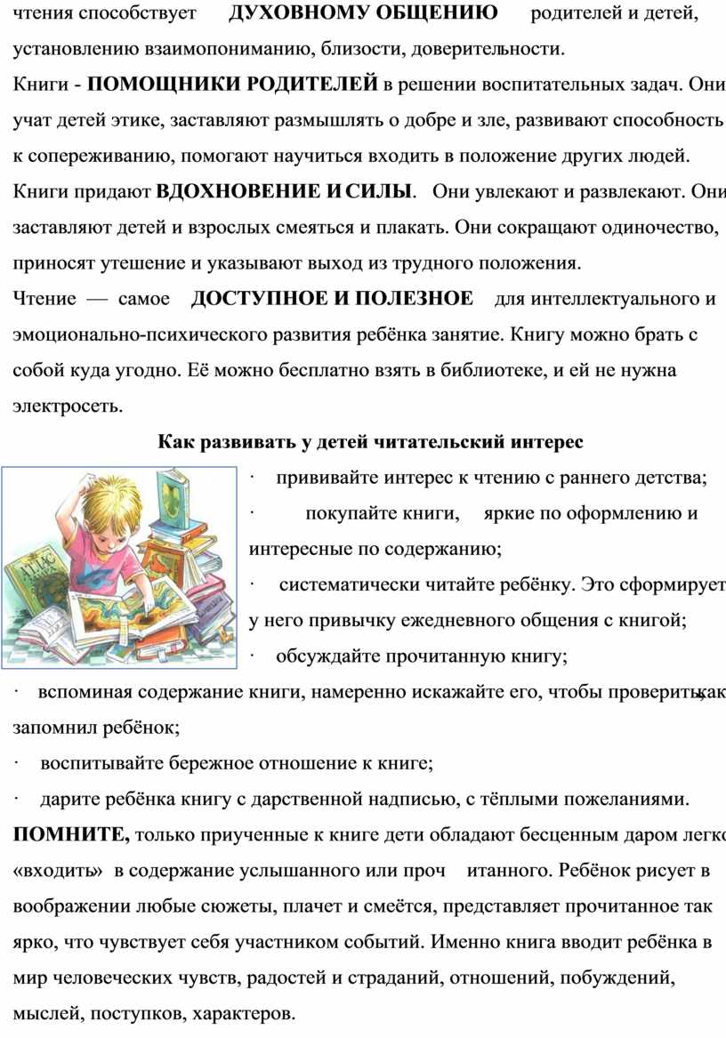 7. Хорошую детскую книгу можно читать ребёнку вслух. Процесс совместного чтения способствует ДУХОВНОМУ ОБЩЕНИЮ родителей и детей, установлению взаимопониманию, близости, доверительности.