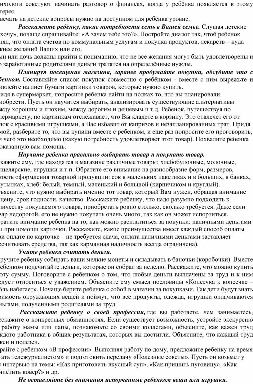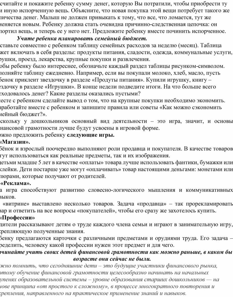 Мир финансов только на первый взгляд кажется далеким от ребёнка. На самом деле дети очень рано включаются в экономическую жизнь семьи. Когда идут с родителями в магазин, смотрят рекламу по телевизору, едут с родителями в общественном транспорте, идут в места бесплатного либо платного отдыха и развлечений.