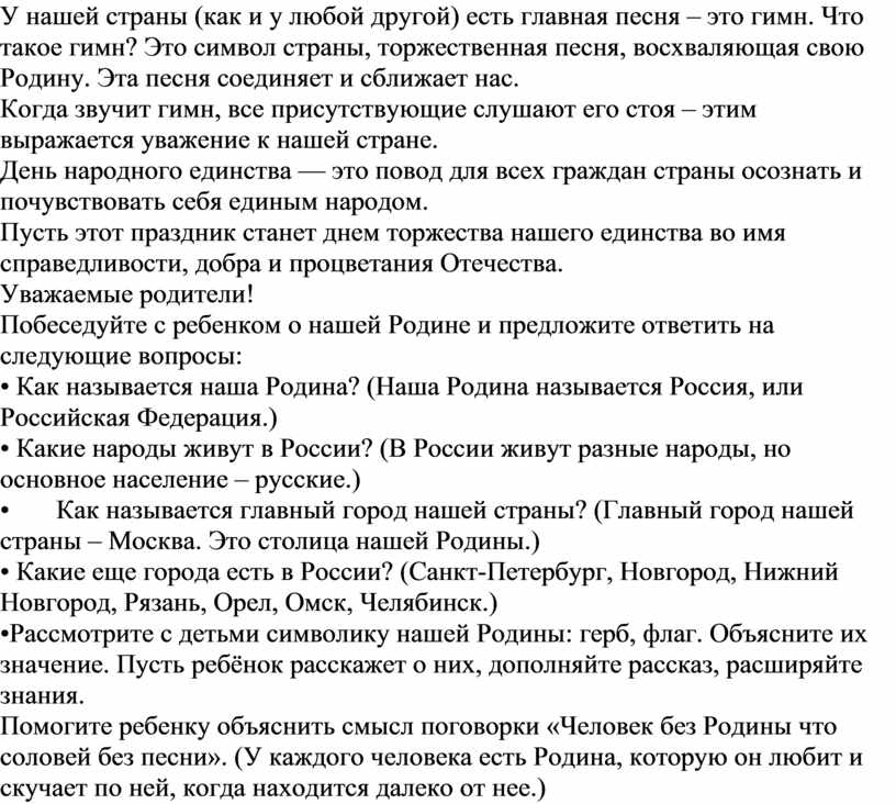 Уважаемые родители, предлагаем информацию, которая поможет вам рассказать детям о праздновании дня народного единства.