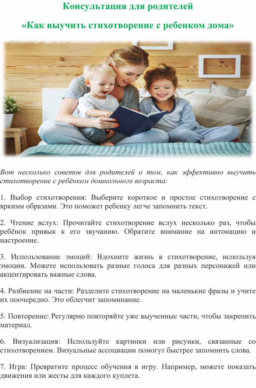 Вот несколько советов для родителей о том, как эффективно выучить стихотворение с ребёнком дошкольного возраста: