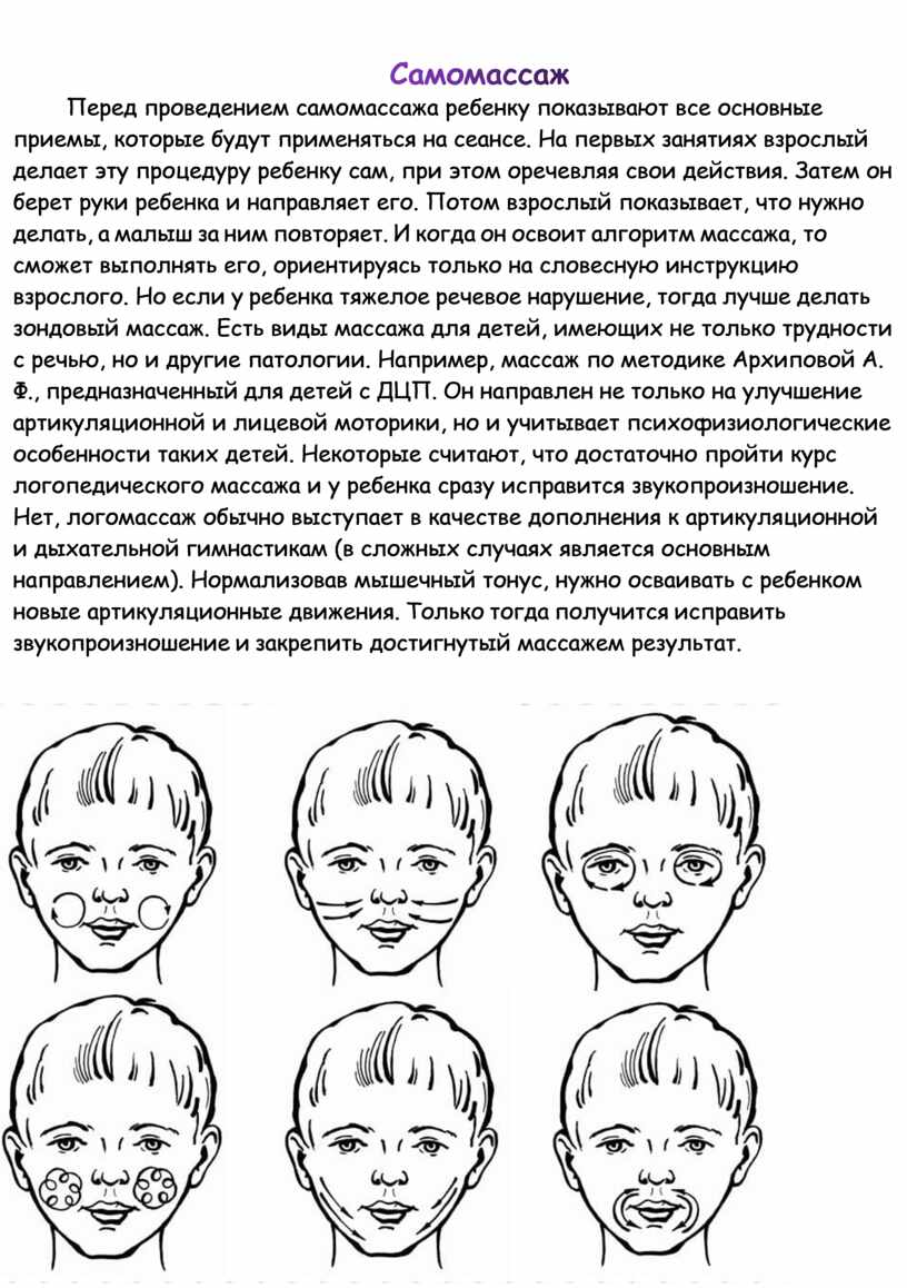 Перед проведением самомассажа ребенку показывают все основные приемы, которые будут применяться на сеансе. На первых занятиях взрослый делает эту процедуру ребенку сам, при этом оречевляя свои действия. Затем он берет руки ребенка и направляет его. Потом взрослый показывает, что нужно делать, а малыш за ним повторяет. И когда он освоит алгоритм массажа, то сможет выполнять его, ориентируясь только на словесную инструкцию взрослого. Но если у ребенка тяжелое речевое нарушение, тогда лучше делать зондовый массаж. Есть виды массажа для детей, имеющих не только трудности с речью, но и другие патологии. Например, массаж по методике Архиповой А. Ф., предназначенный для детей с ДЦП. Он направлен не только на улучшение артикуляционной и лицевой моторики, но и учитывает психофизиологические особенности таких детей. Некоторые считают, что достаточно пройти курс логопедического массажа и у ребенка сразу исправится звукопроизношение. Нет, логомассаж обычно выступает в качестве дополнения к артикуляционной и дыхательной гимнастикам (в сложных случаях является основным направлением). Нормализовав мышечный тонус, нужно осваивать с ребенком новые артикуляционные движения. Только тогда получится исправить звукопроизношение и закрепить достигнутый массажем результат.