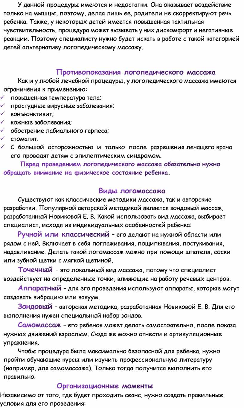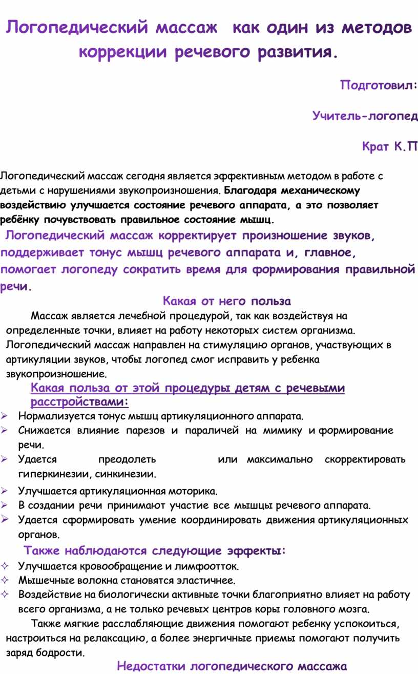 Массаж является лечебной процедурой, так как воздействуя на определенные точки, влияет на работу некоторых систем организма. Логопедический массаж направлен на стимуляцию органов, участвующих в артикуляции звуков, чтобы логопед смог исправить у ребенка звукопроизношение.