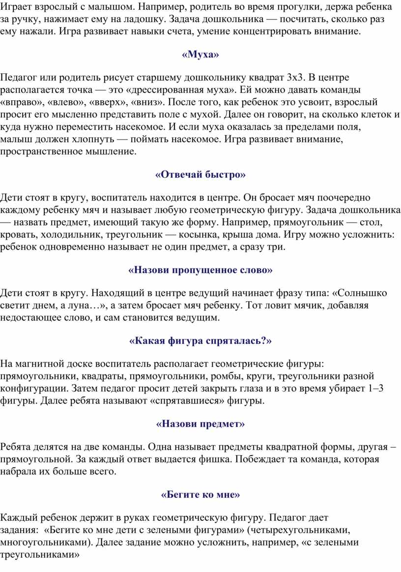 Педагог или родитель рисует старшему дошкольнику квадрат 3х3. В центре располагается точка — это «дрессированная муха». Ей можно давать команды «вправо», «влево», «вверх», «вниз». После того, как ребенок это усвоит, взрослый просит его мысленно представить поле с мухой. Далее он говорит, на сколько клеток и куда нужно переместить насекомое. И если муха оказалась за пределами поля, малыш должен хлопнуть — поймать насекомое. Игра развивает внимание, пространственное мышление.