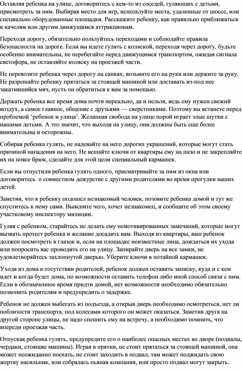 Держать ребенка все время дома почти нереально, да и нельзя, ведь ему нужен свежий воздух, а самое главное, общение с друзьями — сверстниками. Поэтому вы встанете перед проблемой ‘ребенок и улица’. Желанная свобода на улице порой играет злые шутки с нашими детьми. А это значит, что выходя на улицу, они должны быть еще более внимательны и осторожны.